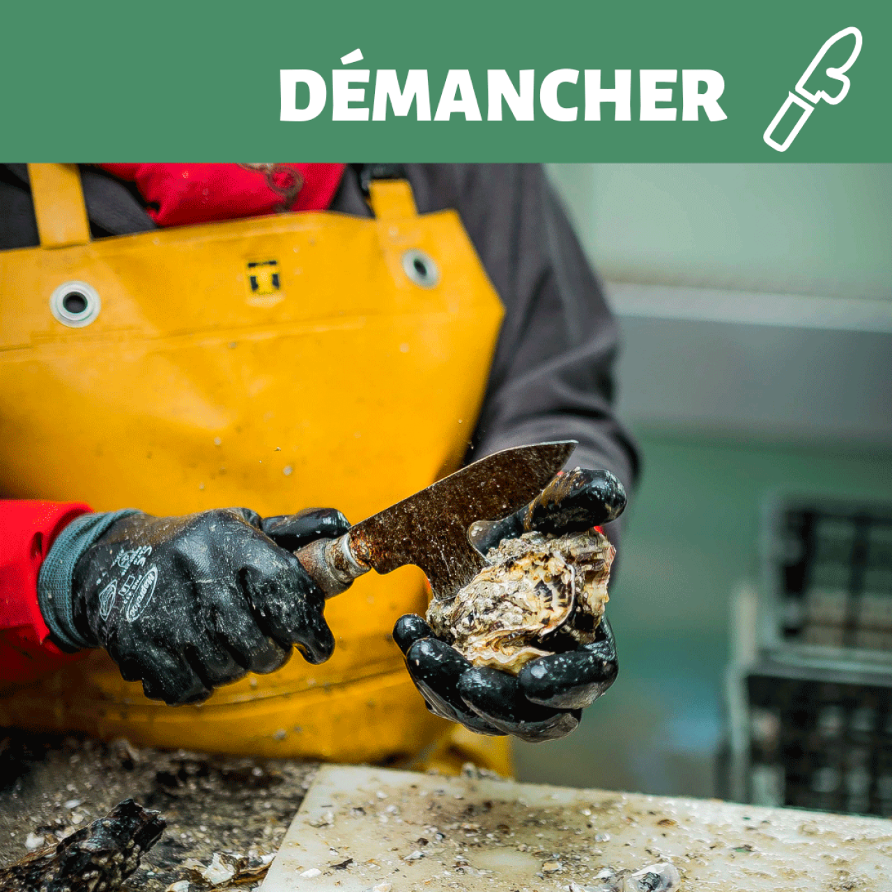 C’est le moment pour nos huîtres d’être retirées de leurs parcs ! Avec un démanchoir, on sépare les huîtres qui s’étaient collées les unes aux autres en prenant soin de ne pas abîmer les huîtres. Enfin, elles sont triées par calibre.